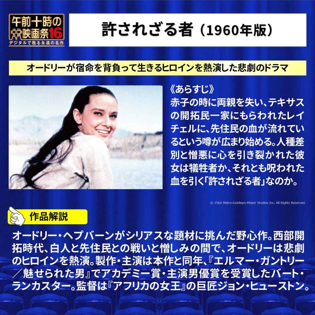 ✑【『許されざる者』といえば、イーストウッドの92年度作の前に、この大作西部劇があった。白人開拓者に育てられた先住民の娘(オードリー・ヘプバーン)を愛するカウボーイ(バート・ランカスター)が、差別的な白人たちと、彼女を奪還しようとする先住民の両方と戦う。血煙の荒野に名女優リリアン・ギッシュの奏でるモーツァルトが鳴りわたる!】